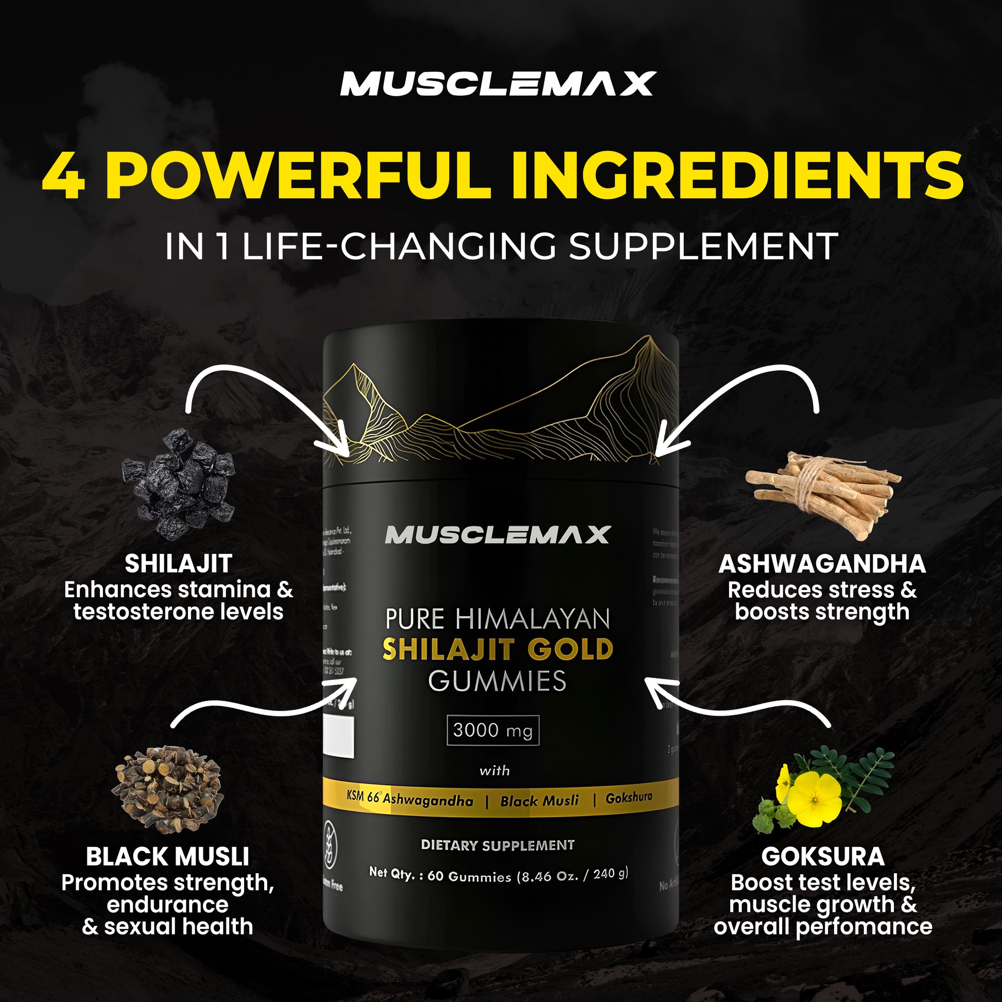 Inside MuscleMax's gummies there is Shilajit, Ashwagandha, Black Musli and Gokshura.