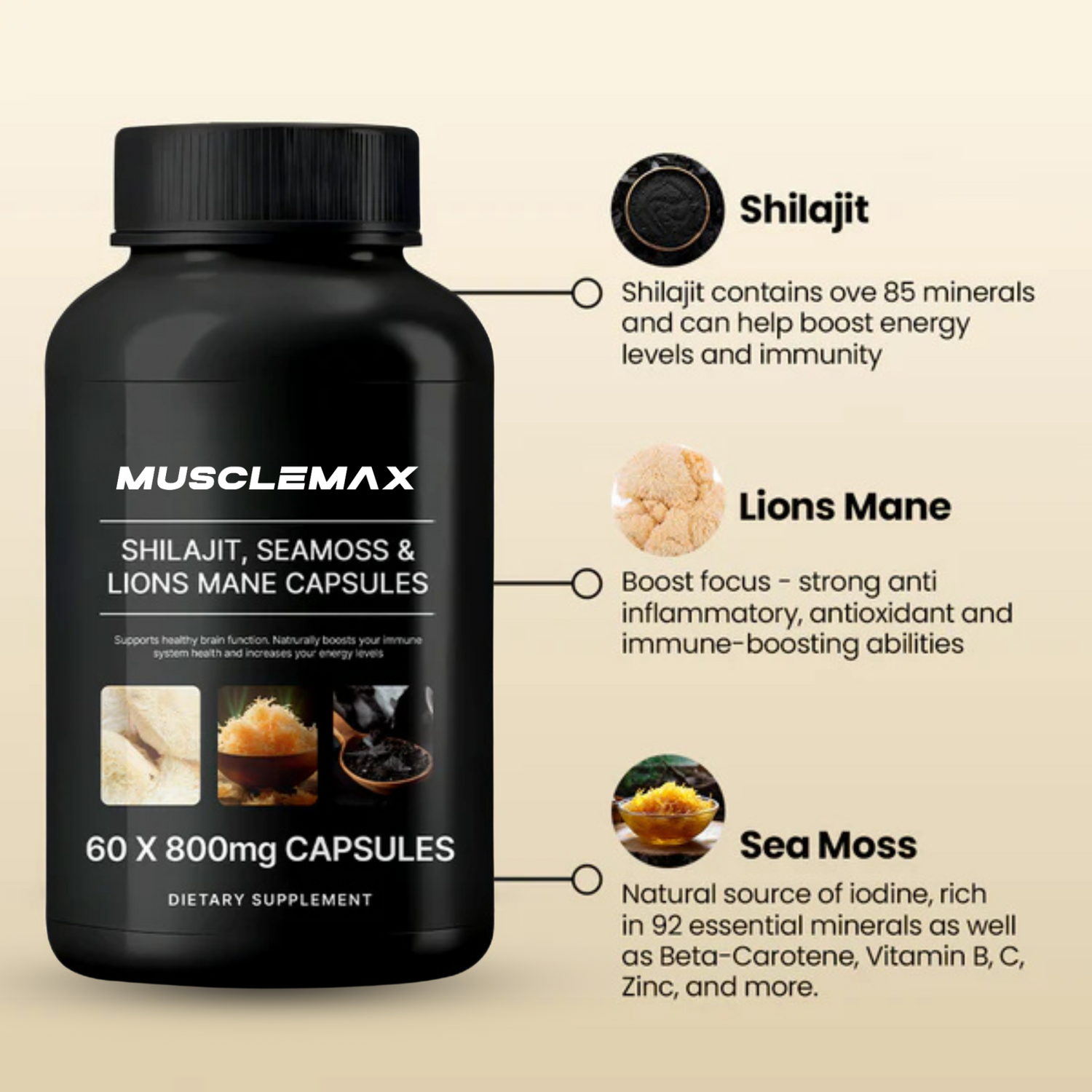 Our Shilajit, Sea Moss, and Lion's Mane blend combines the best of all worlds. Shilajit boosts energy, Sea Moss supports overall health with 92 minerals, and Lion's Mane sharpens focus. Three powerful ingredients, one easy supplement.